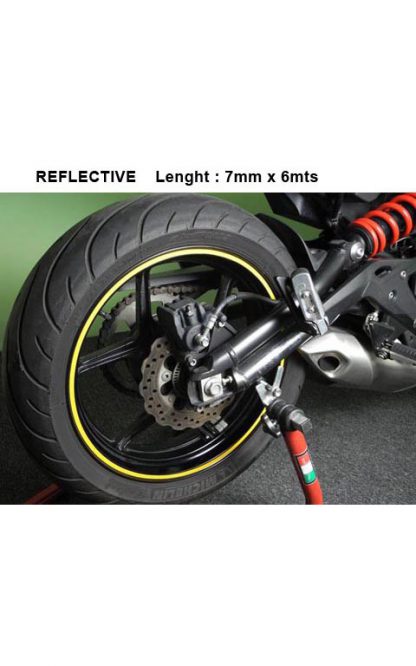 Wheel Stripe / Felgenrand Aufkleber durchgehend Reflektierender Klebestreifen für die Felge Durch den mitgelieferten Abroller ist das Aufbringen auf den Felgenrand kinderleicht aus selbstklebender reflektierender Spezialfolie einfaches montieren durch mitgelieferte Montagehilfe einfach am Felgenrand ansetzen und abrollen Breite: 7 mm Länge: 6 Meter (reicht für 2 Felgen Reserve) Natürlich Rückstandsfreie Entfernung möglich! Farbe Gelb