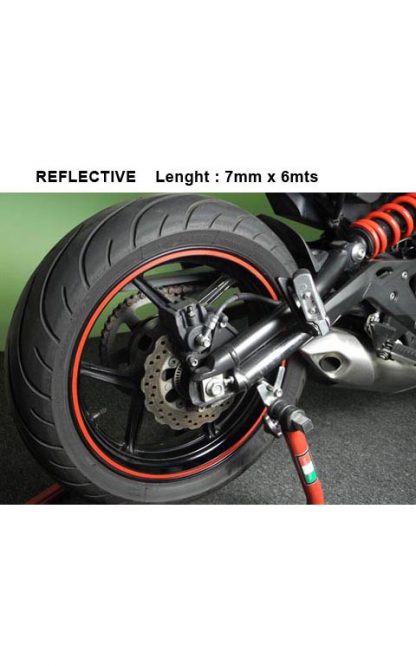 Wheel Stripe / Felgenrand Aufkleber durchgehend Reflektierender Klebestreifen für die Felge Durch den mitgelieferten Abroller ist das Aufbringen auf den Felgenrand kinderleicht aus selbstklebender reflektierender Spezialfolie einfaches montieren durch mitgelieferte Montagehilfe einfach am Felgenrand ansetzen und abrollen Breite: 7 mm Länge: 6 Meter (reicht für 2 Felgen Reserve)  Natürlich Rückstandsfreie Entfernung möglich! Farbe Rot